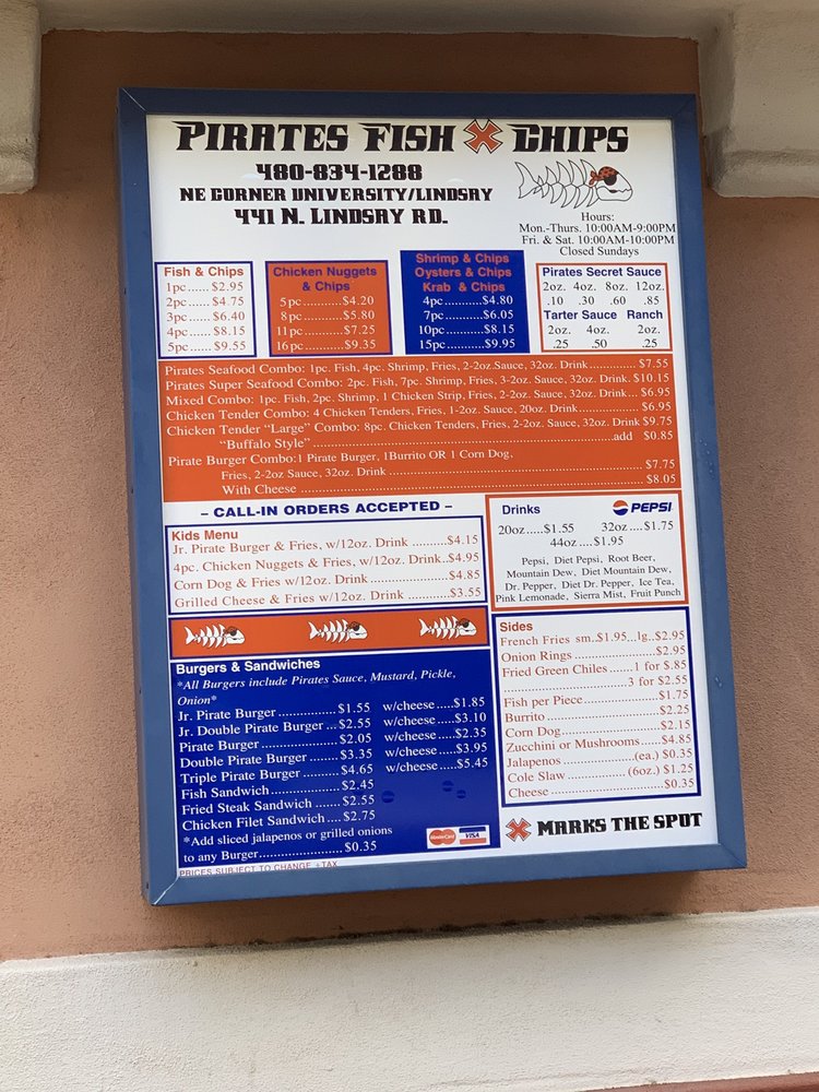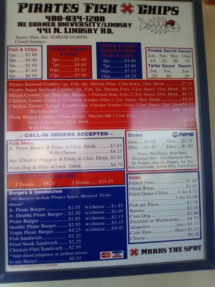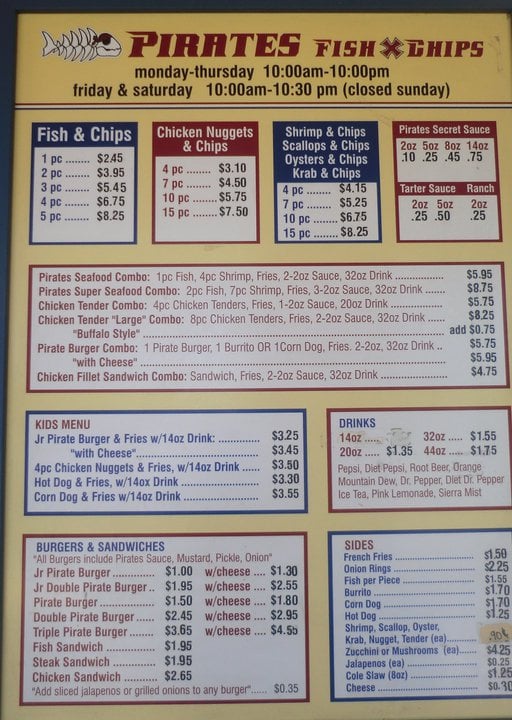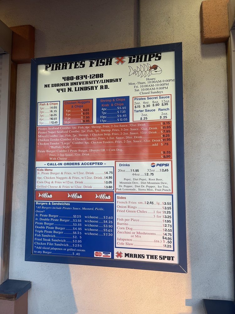 Welcome to Pirates Fish and Chips, a hidden gem in Mesa, AZ that offers a delightful experience for all ages. This casual dining spot is perfect for families, with outdoor seating and a quiet atmosphere. The menu features classic Fish & Chips, along with tasty burgers and sandwiches like the Jr Double Pirate Burger. Don't miss out on their delicious sauces like Tarter Sauce and Ranch Sauce, which perfectly complement the crispy fish. For a satisfying meal, try their Pirates Super Seafood Combo with fish, shrimp, fries, and a drink. The friendly staff provides excellent service, making your visit memorable. Next time you're craving comfort food, head over to Pirates Fish and Chips for a savory meal that will leave you wanting more.